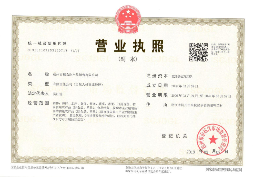 杭州百穗是集農場種植、農產品配送、食品加工、餐飲服務及社區老年食堂為一體的食品安全可追溯源的市級農業龍頭企業,企業擁有杭州百穗農產品種養殖場、百穗農副產品銷售有限公司、百穗食品有限公司、百穗餐飲有限公司,以及由法人控股的杭州學生營養午餐中心(集體配送用餐單位)。